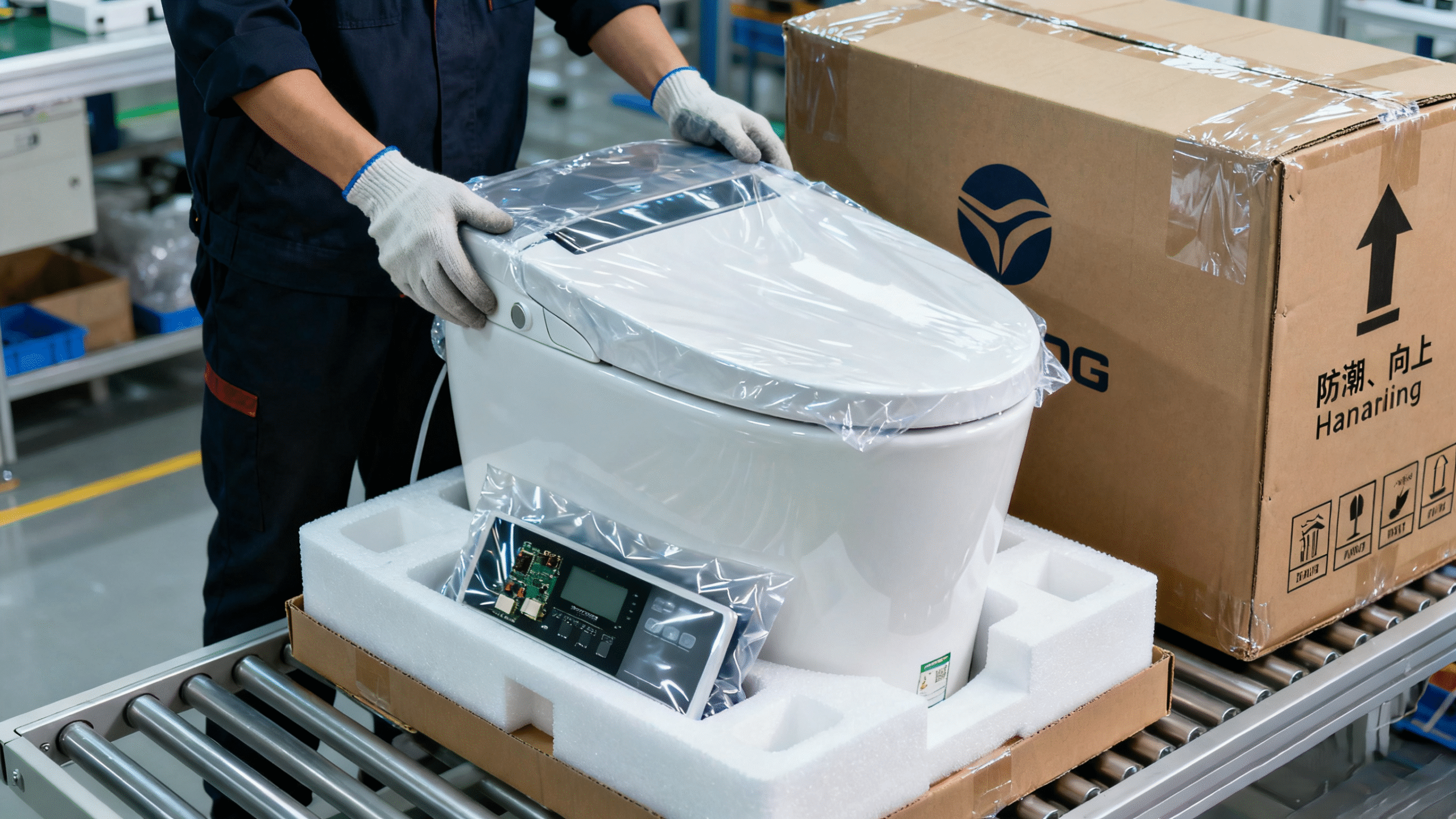 Os componentes do vaso sanitário inteligente (cerâmica frágil, painéis eletrônicos) são embalados com materiais resistentes à umidade e a choques para evitar danos durante o transporte.